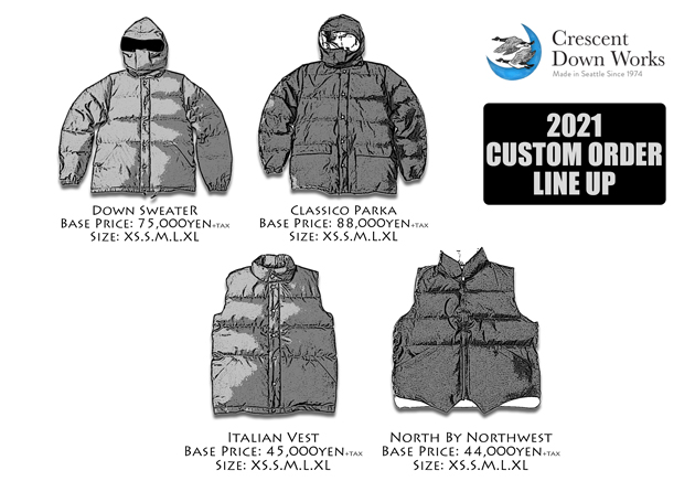 毎年好評いただいております"Crescent Down Works/クレセントダウンワークス"のカスタムオーダー会を開催いたします!