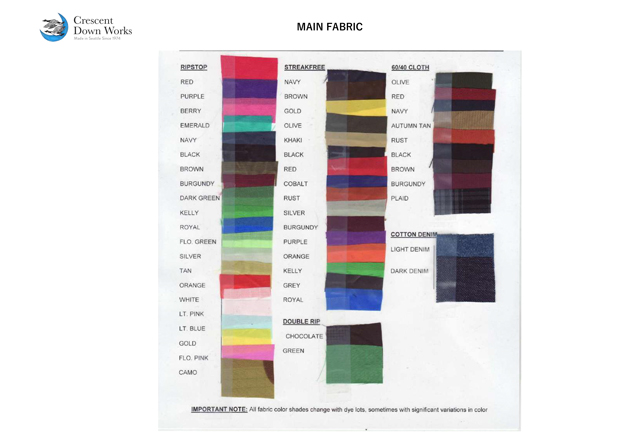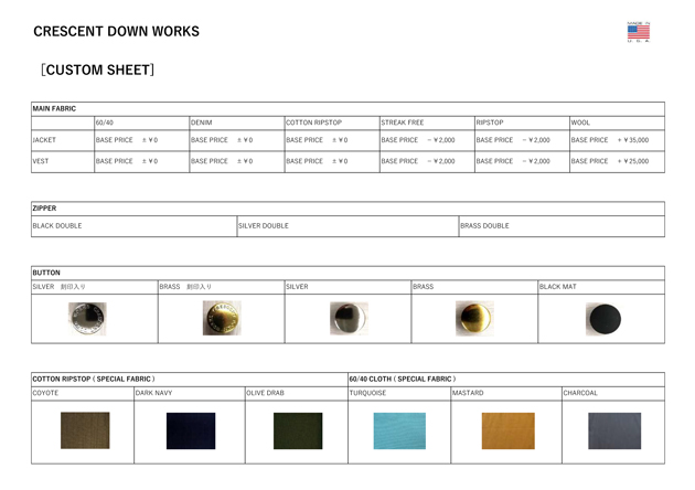 様々なモデルが存在し、多くのファブリックが用意されているCrescent Down Works、昨今では流行のような状態となってしまっているダウンジャケットですが、オリジナリティ溢れる 貴方だけの一着をカスタムオーダーできる喜びを是非お楽しみ下さいませ。