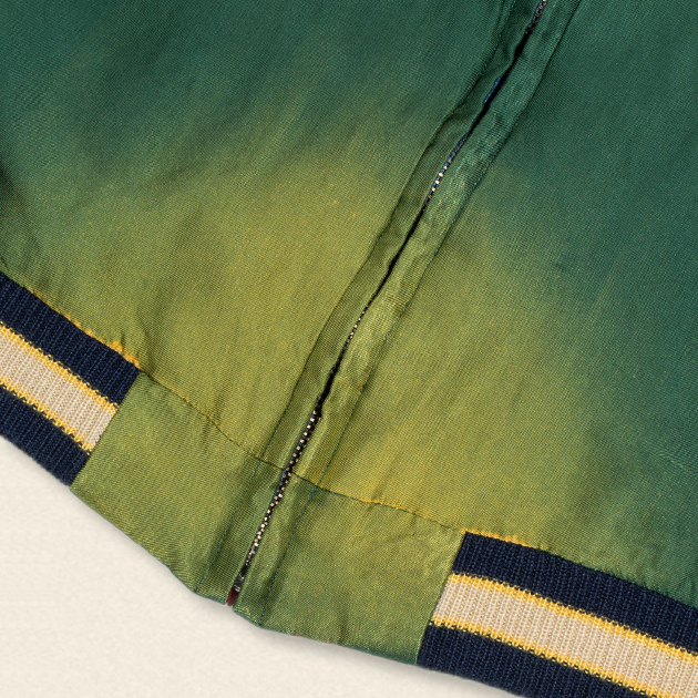 通常グリーンに薬品を用いるとピンク色っぽく変色してしまいますが、テーラー東洋では当時の染料の変色を研究し、所有するヴィンテージと同じ色味になるよう手作業で加工しております。