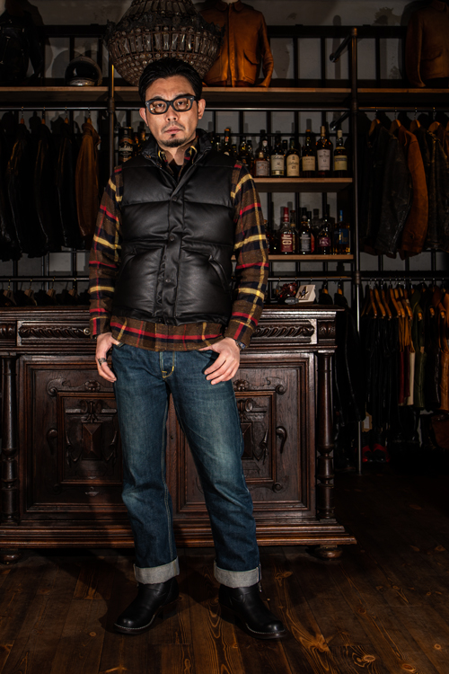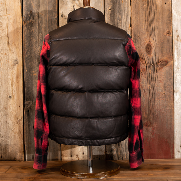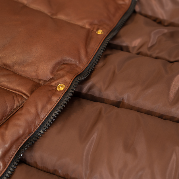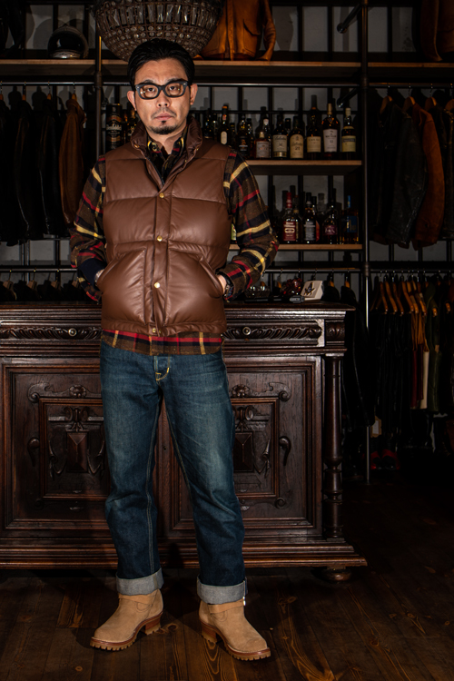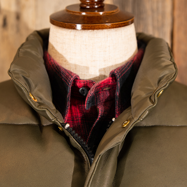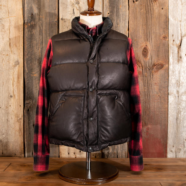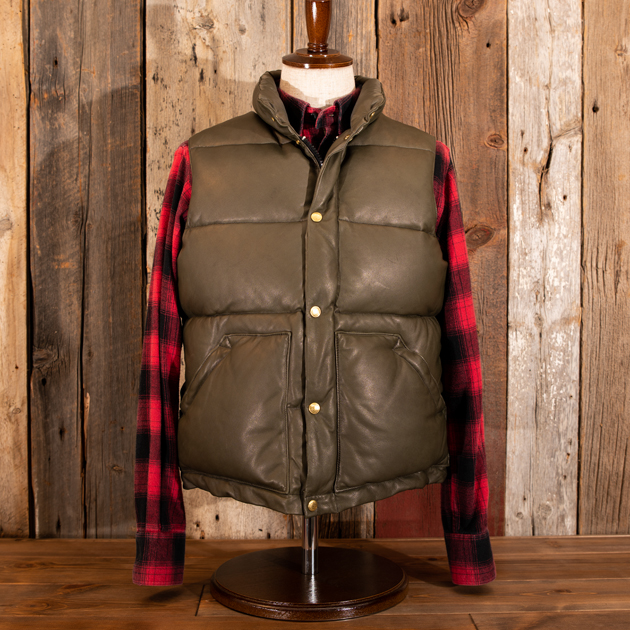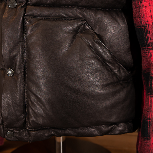 それにダウンベストに求められる柔らかさと強靭さを付与するためクローム鞣しを採用し、アニリンフィニッシュによって仕上げられております。