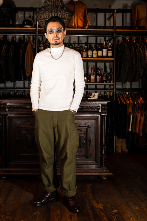 低めにスタンドしておりタートルネックほどボリュームも出ず、折り返す必要がないのですっきりした襟周りも特徴です。