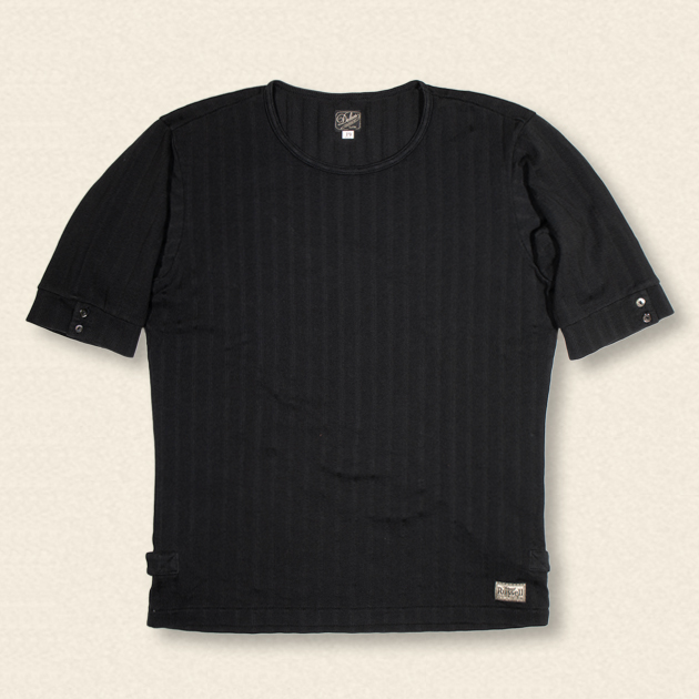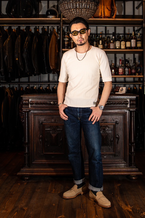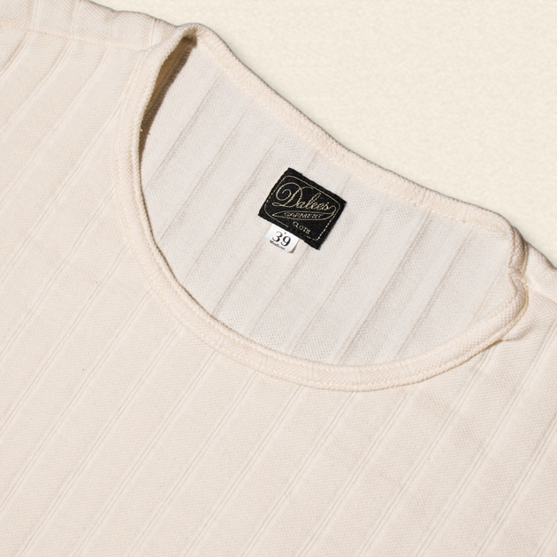 身体に沿ったフィット感とワイドな首周り、ピケ編みによる柄がオールド感を演出します。