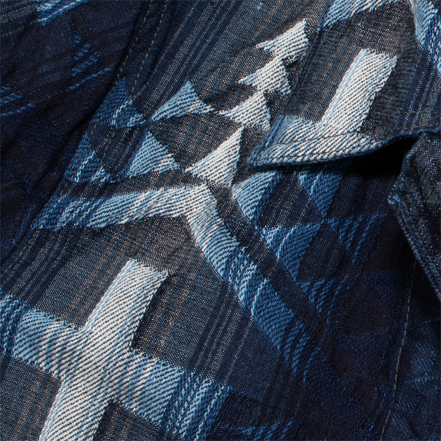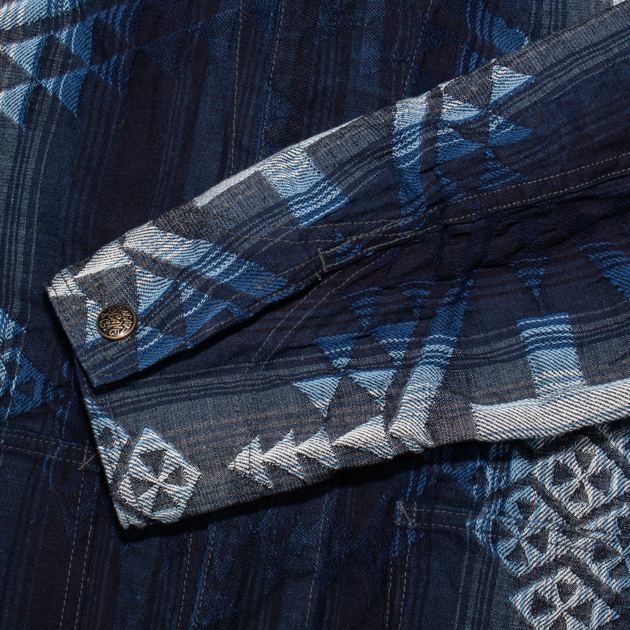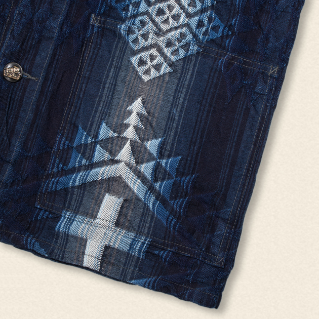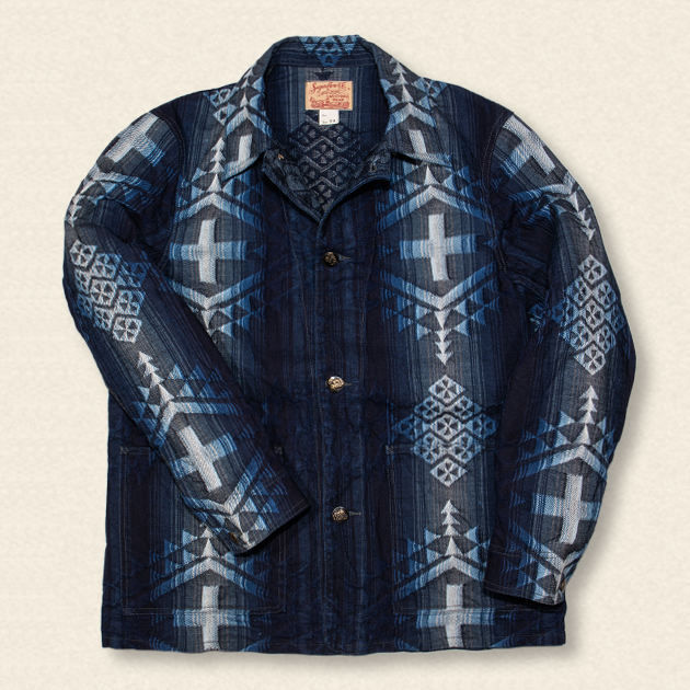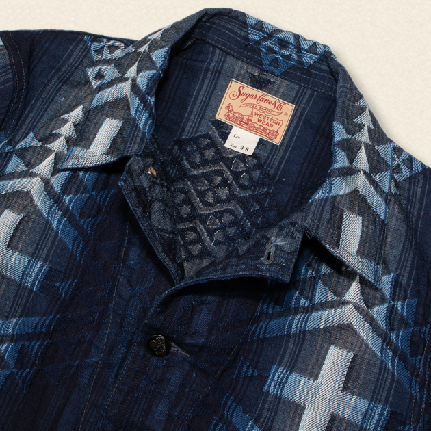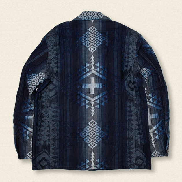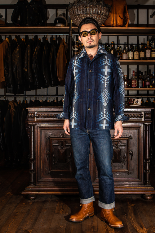 今回SUGAR CANEからリリースされるこちらのアイテムに使用されるネイティブアメリカンデニムは、そんなブランケットをベースに、ウール糸をコットンジャガード生地に置き換え、色鮮やかな配色を4段階に染色したインディゴ糸で表現しております。