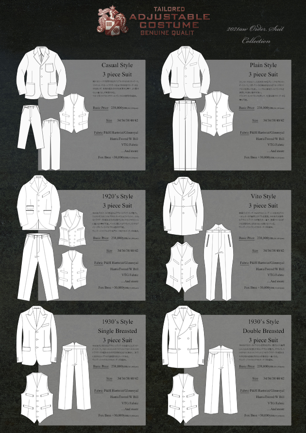 ADJUSTABLE COSTUMEの通常ラインナップでは、英国Joseph H.Clissold(ジョセフ H.クリソルド)のFINE WORSTEDを使用して作られ、非常に美しい完成度となっております。