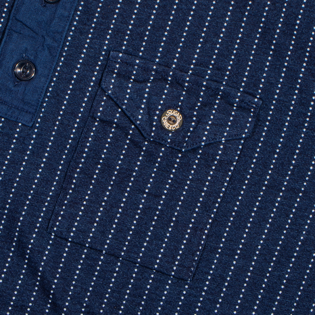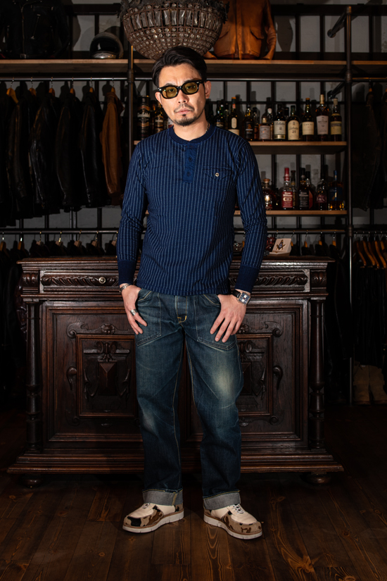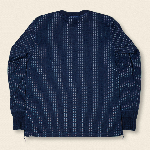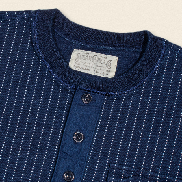 1950年代のヘンリーネックTシャツをベースに、SUGAR CANEオリジナルのウォバッシュストライプ天竺を使用した一着。