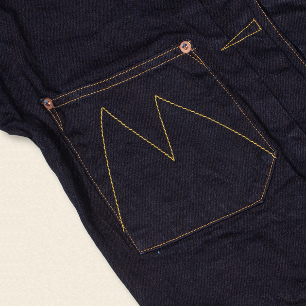 着用によって擦れる箇所は通常通り白芯が出てまいりますので、新品時の均一な発色から濃淡がくっきり出、最終的には青から白へのグラデーションが強く発生する唯一無二の経年変化を進めていくことでしょう。