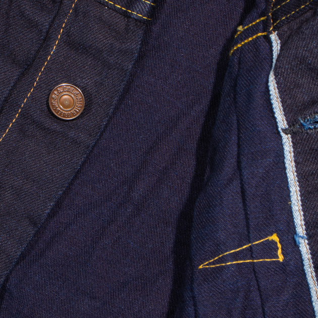 そのためデニムをひっくり返していただくと緯糸の色が現れるのですが、この”DOUBLE INDIGO”は経緯ともにインディゴ糸ですので、生地裏も表面と同様のインディゴ色が現れます。