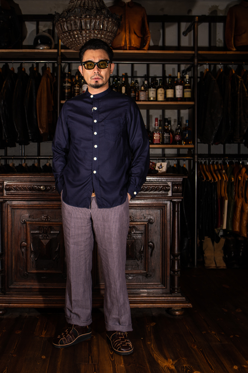 レーヨンのL/S SHIRTS、グルカサンダルで春夏を意識したコーディネート。