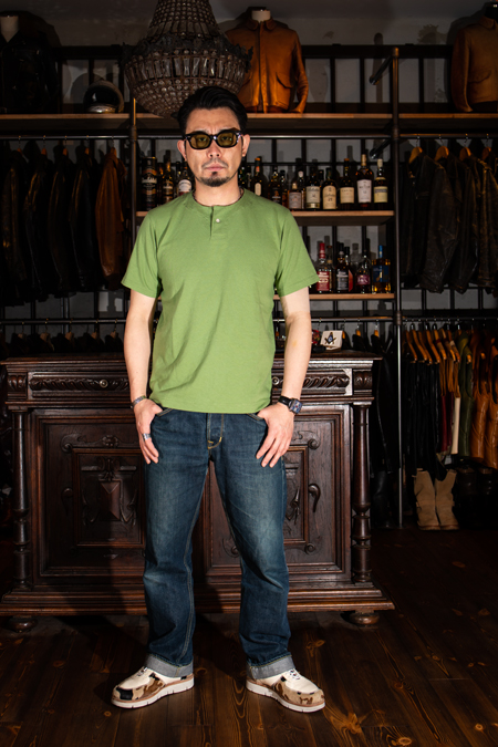 シンプルなベーシックでスタンダードな一枚ではありますが、プレーンのクルーネックに物足りなさを少し感じた日には、さり気ないこのヘンリーネックが丁度良い。