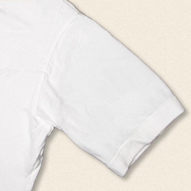 首元、裾、袖に使用されているリブはクラシックなユニフォームなどに使用されるような針抜きリブ。