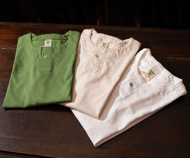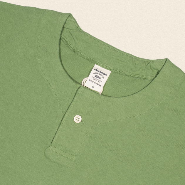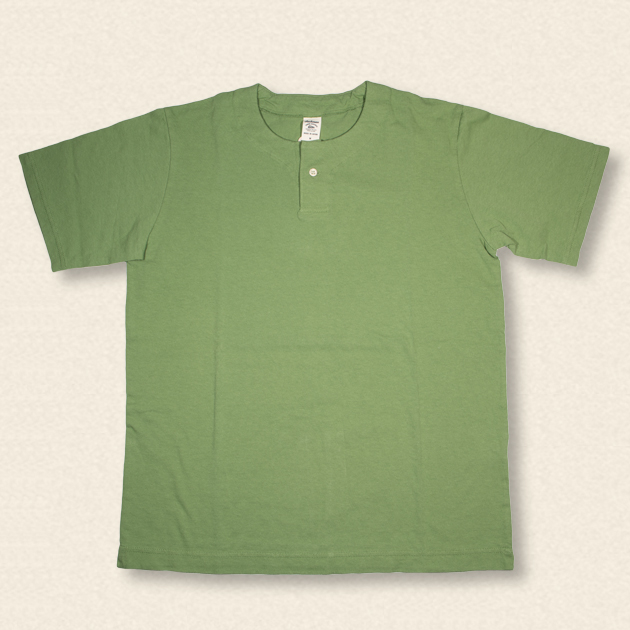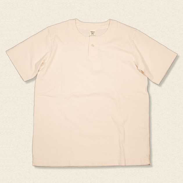 一般的なヘンリーネックとは違い、ネック部分にはリブを使用せずシャツのような見返しを付けた仕様。