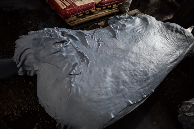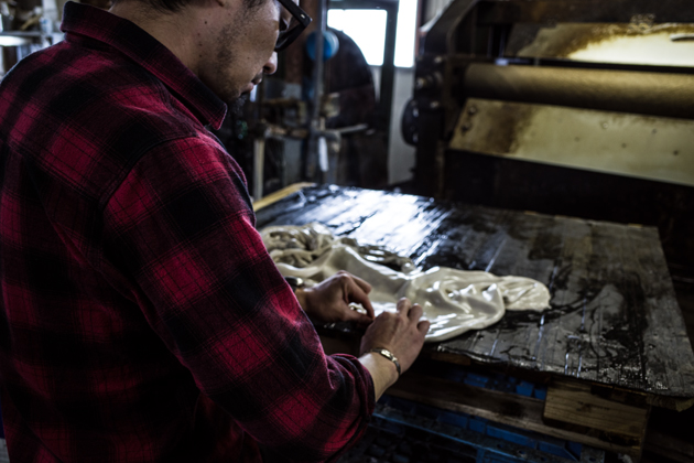 長年の歴史で培われた日本タンナーによる鞣し行程、乾 燥、着色、仕上げと、ひとつひとつの行程で繊細な手仕事が入る。