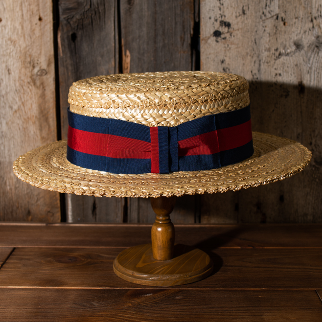 海や川の水しぶきで帽子が柔らかくなって損傷するのを防ぐため、麦藁を平たくつぶして紐のように編んでプレスで固く成型し、ニスや糊などで塗り固めることにより軽くて耐久性のある帽子です。