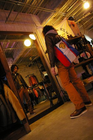 TOYS McCOY:SMILE HELMETS BAG[TSA1101]を肩に掛け、身なりをチェック