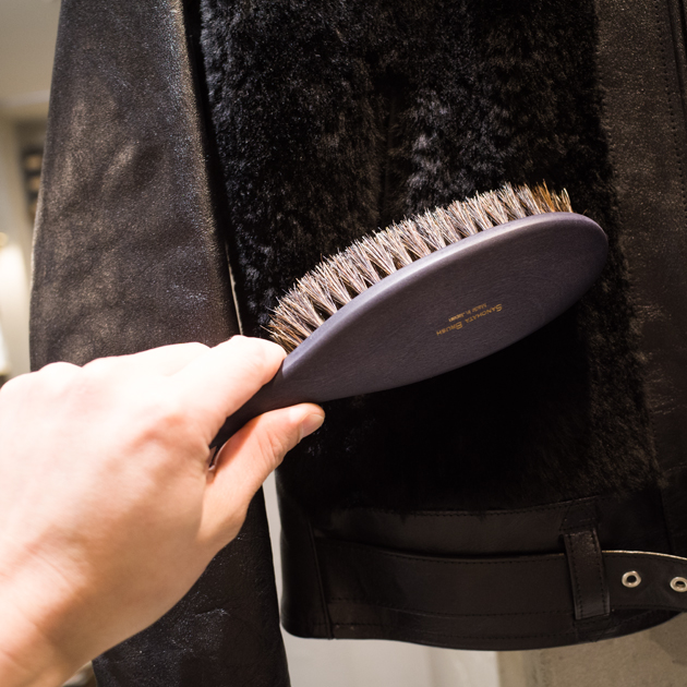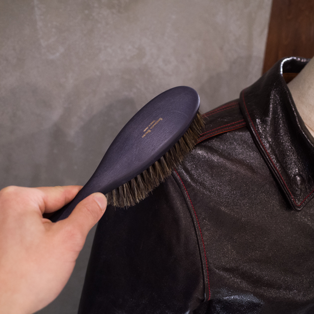 繊細な皮革を傷つけずに、付着したホコリを除去する靴用ブラシで培ったノウハウを活かして開発された洋服用ブラシ。