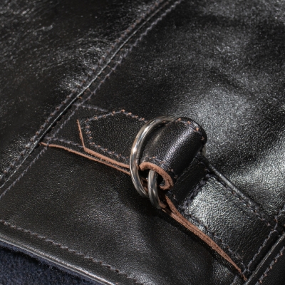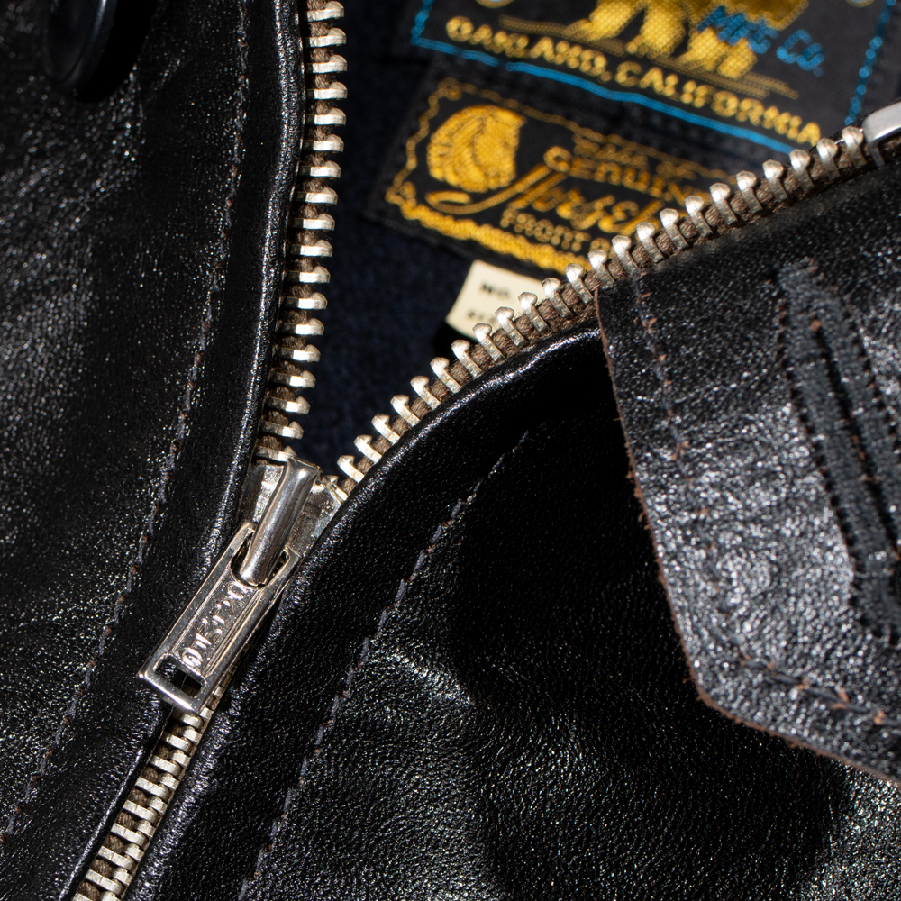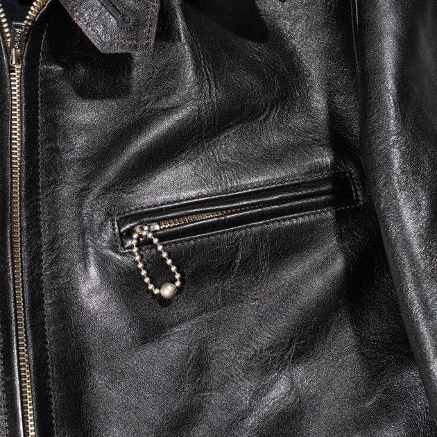 ファスナーは30年代の角型TALONを元にしたオリジナルで、ファスナーテープエンドも実物同様の金属プレートをカシメで止めるタイプを組み合わせ、胸のボールチェーンも実物同様のボールチェーンをオリジナル刻印入りで製作して取り付けている。