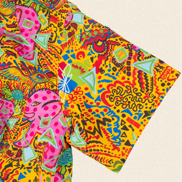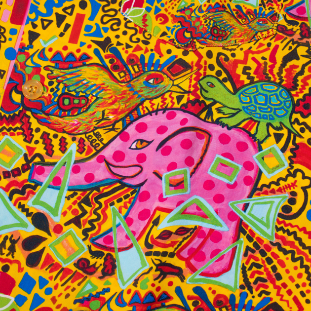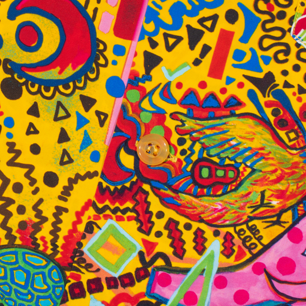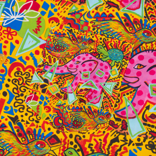 象や亀、鳥をメインモチーフに、ポップなカラーとストーリー性のあるイラストレーションで様々なモチーフが盛り込まれ、見る者を飽きさせない楽しげなデザインとなっております。もしかしたら象や鳥、亀など何かに見立ててるのかもしれませんが…