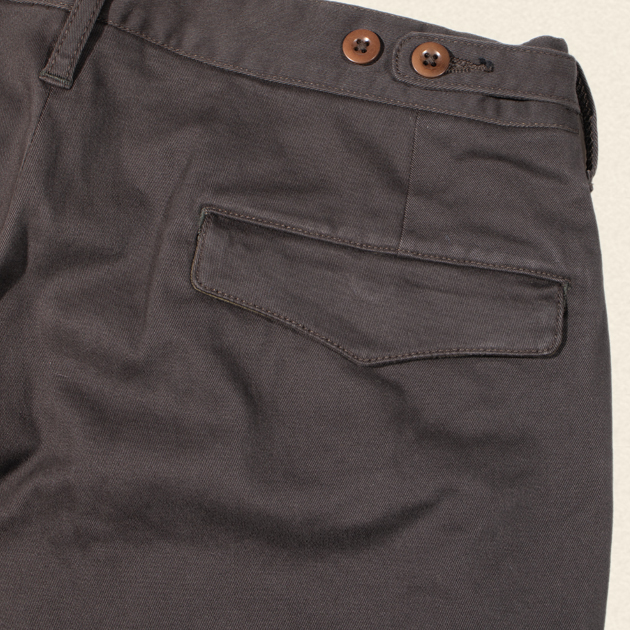 ナットボタンや両玉縁仕立てのハンドポケット、バックポケットのフラップ仕様等といったディテールは、クラシカルな意匠を採用しております。