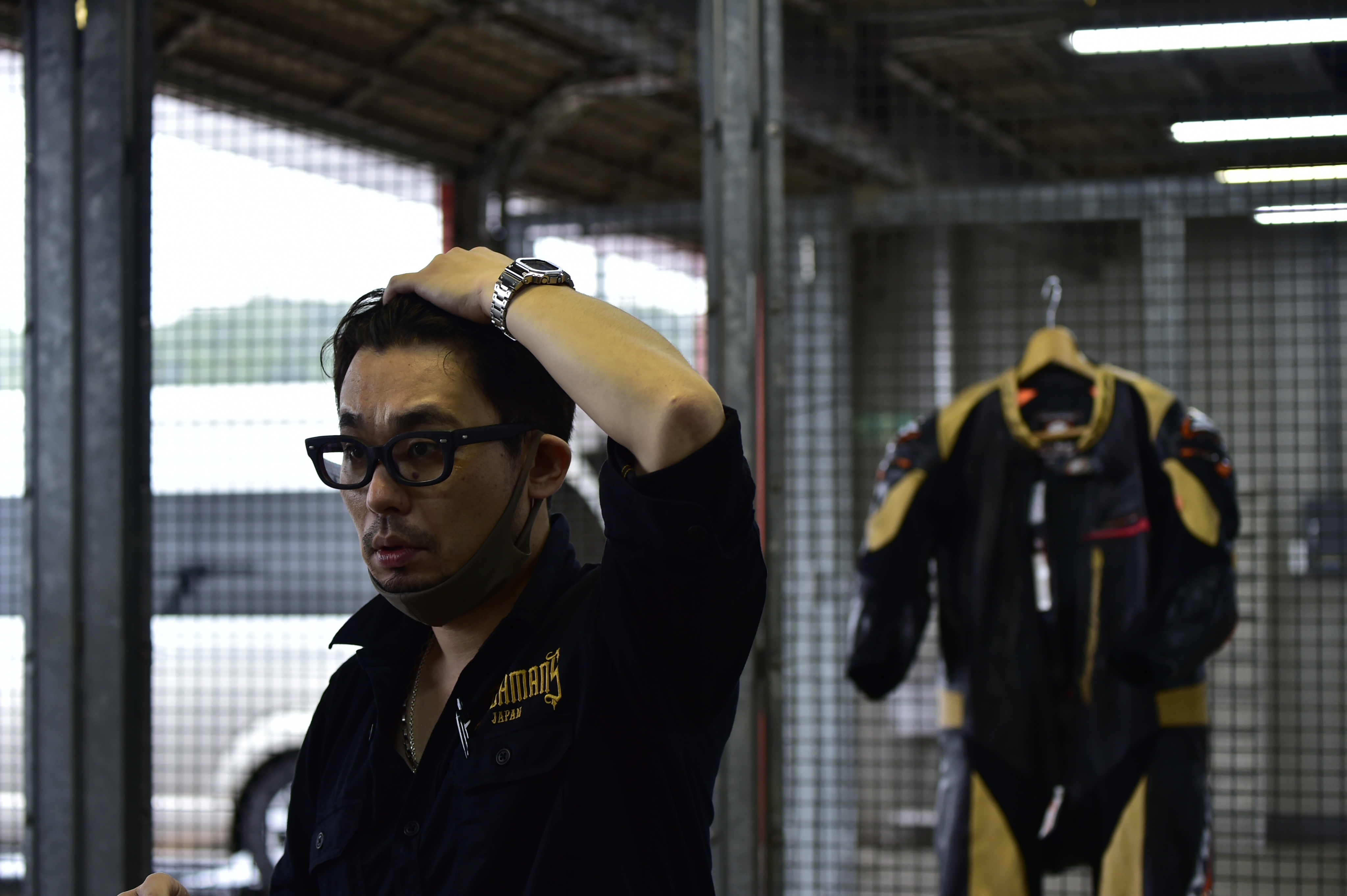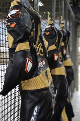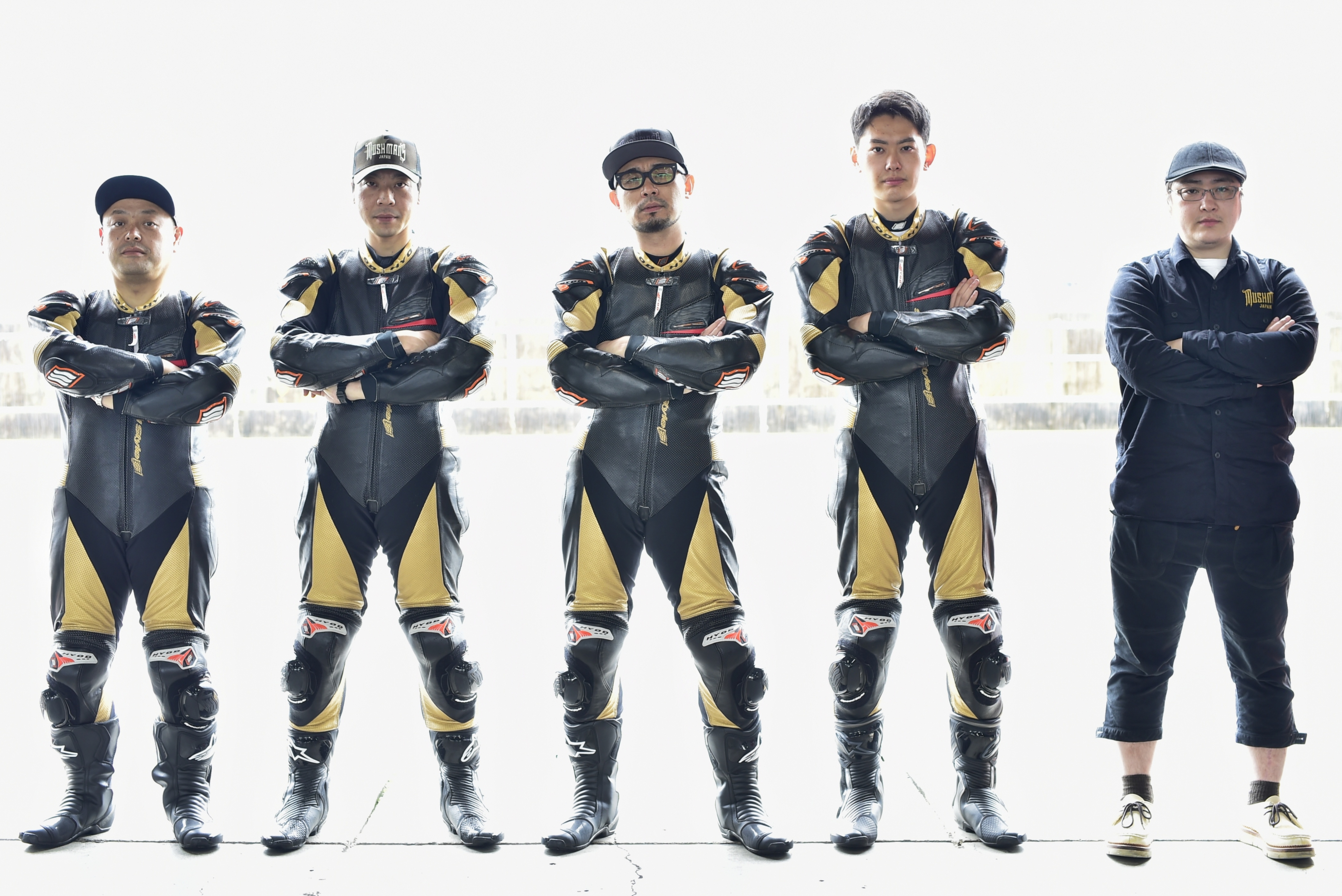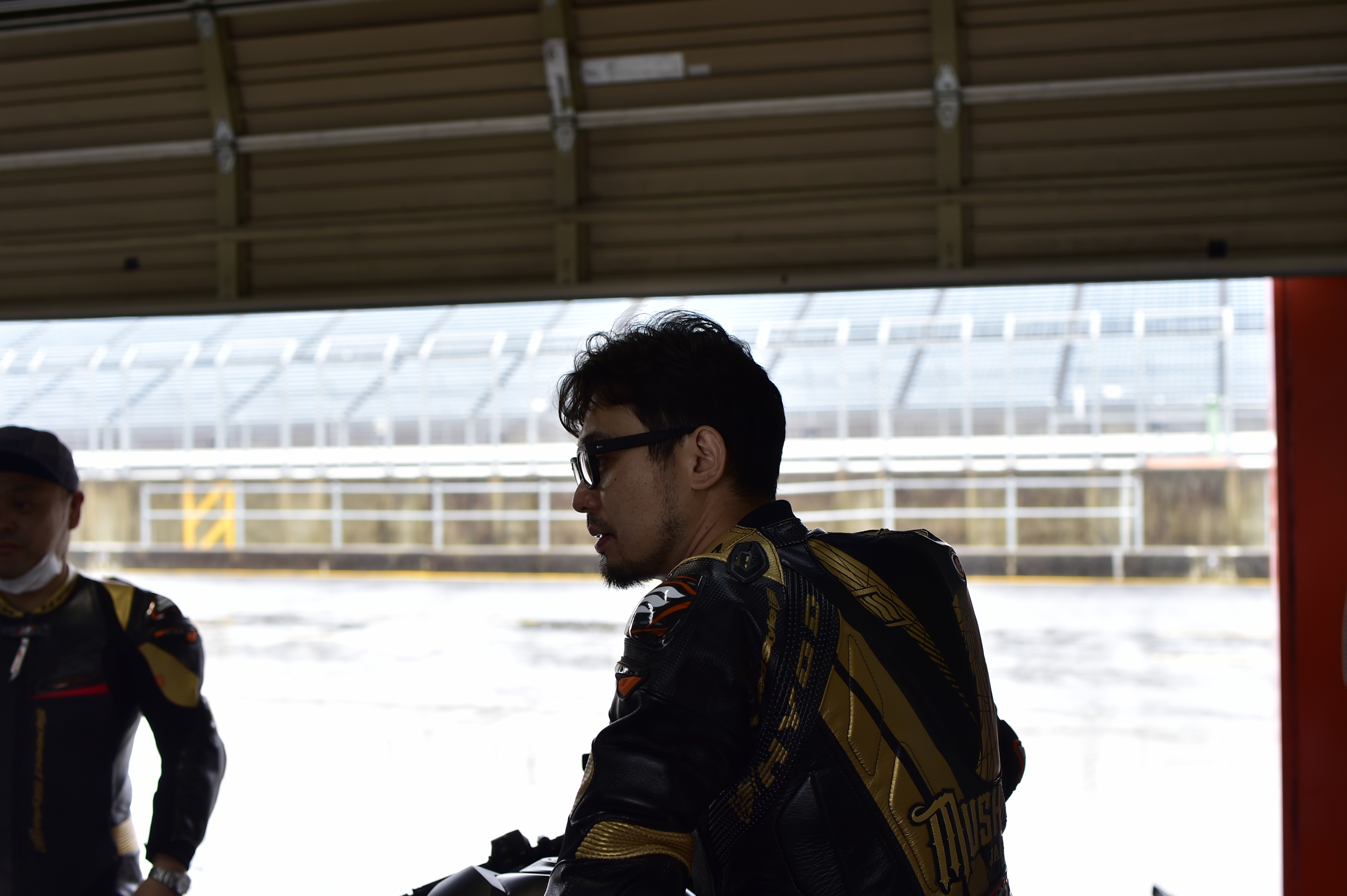 揃いのレーシングスーツは中々の存在感。