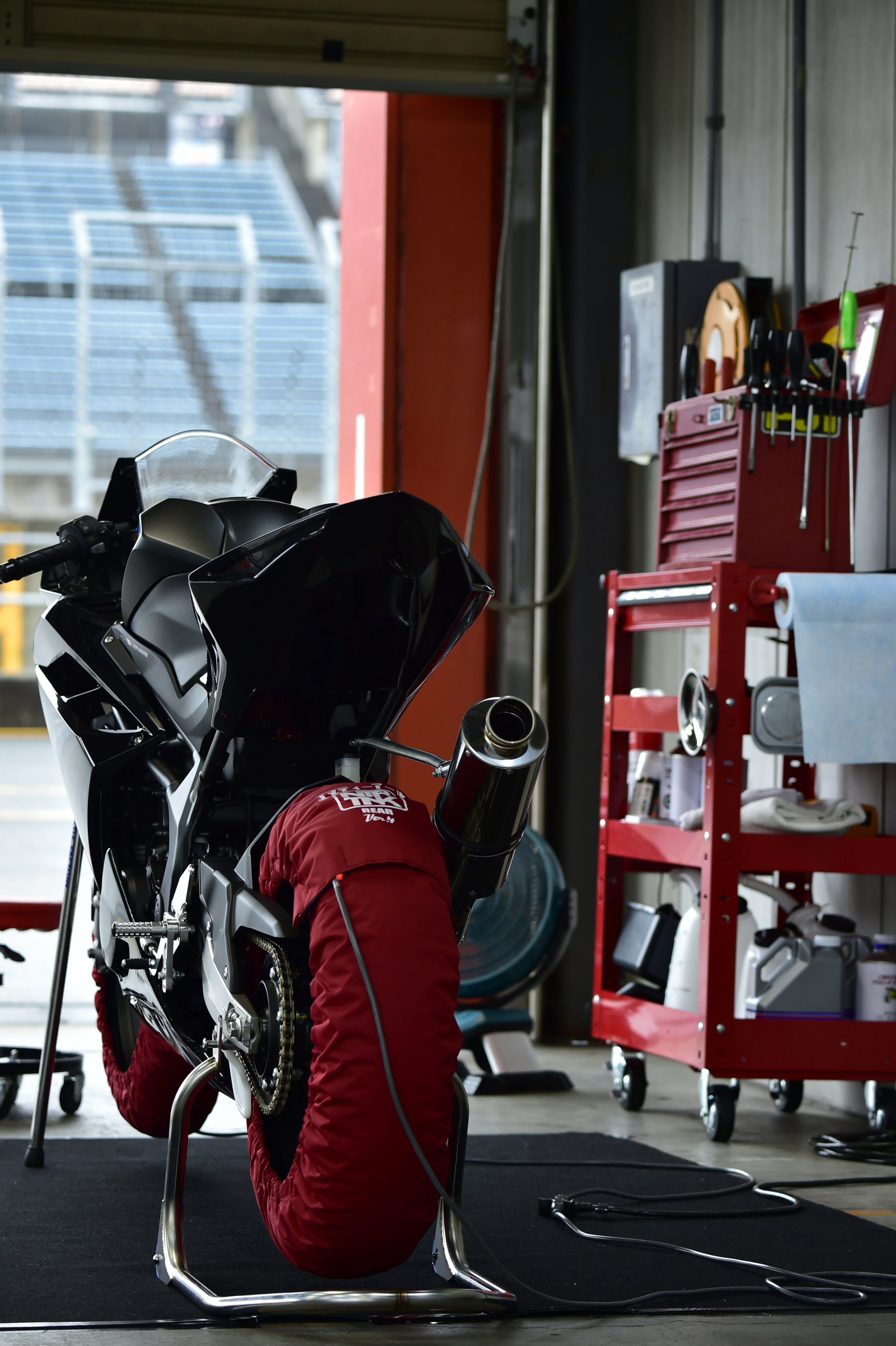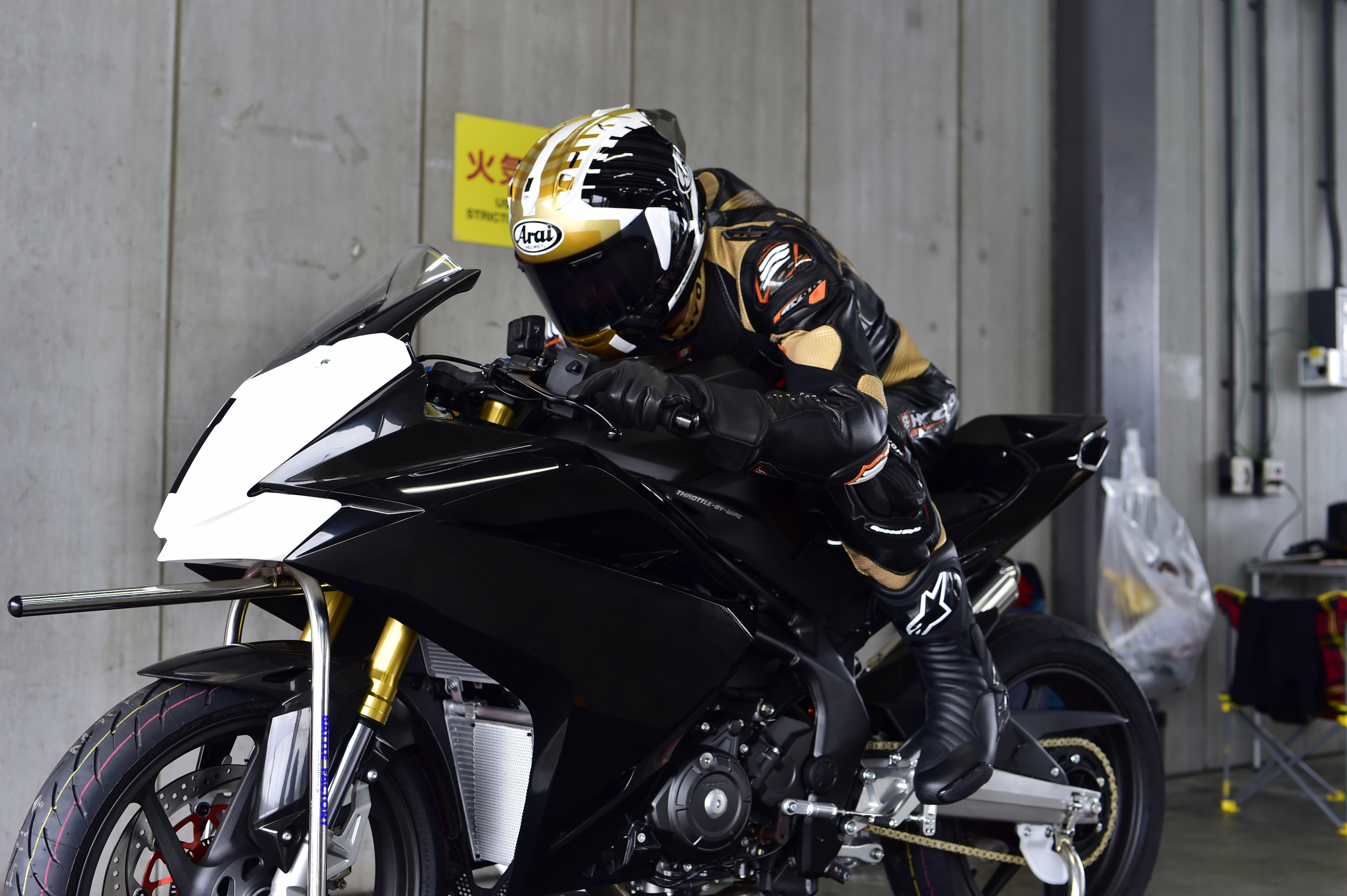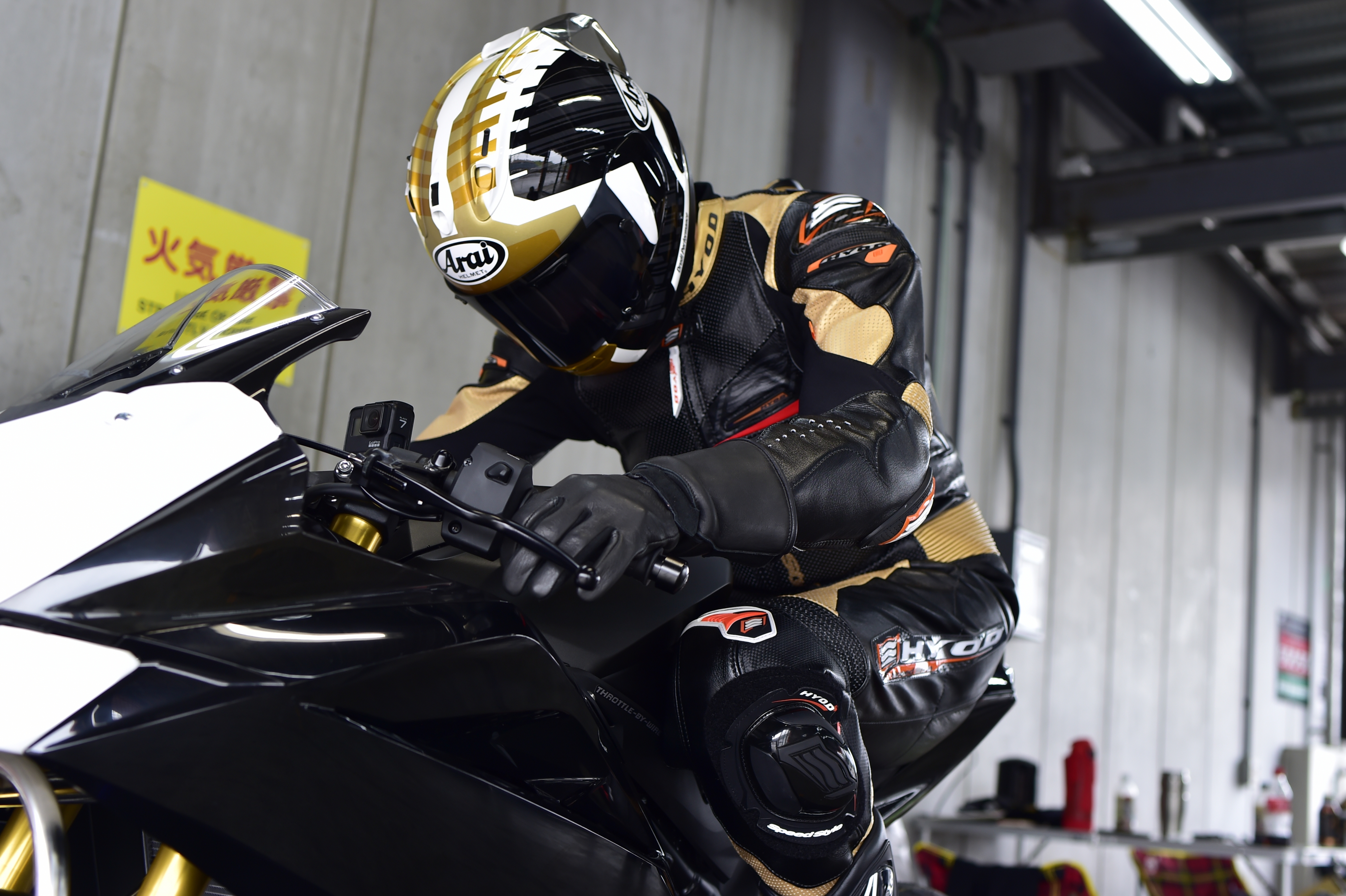 揃いのレーシングスーツは中々の存在感。