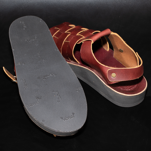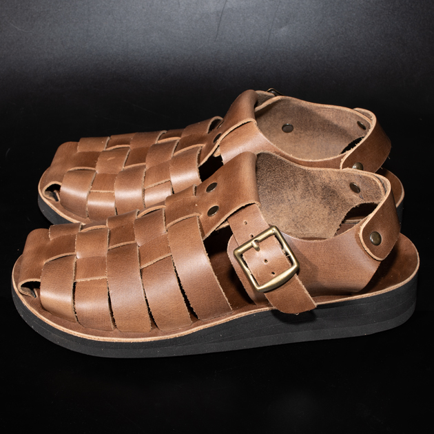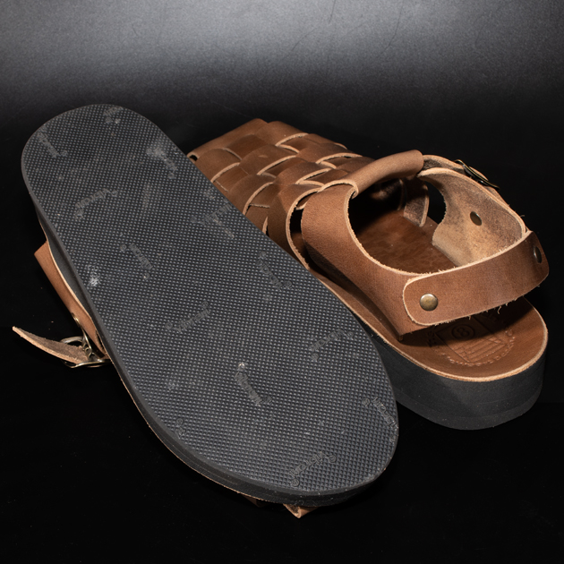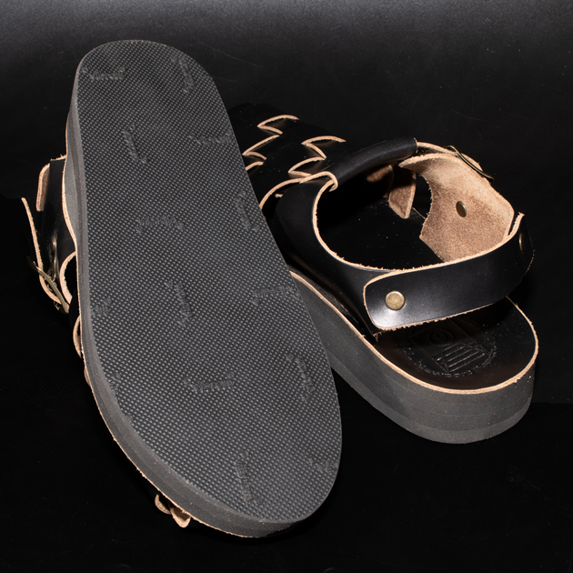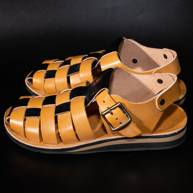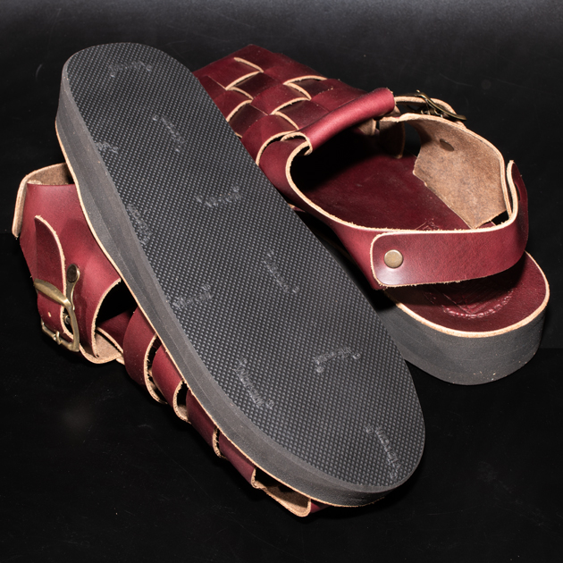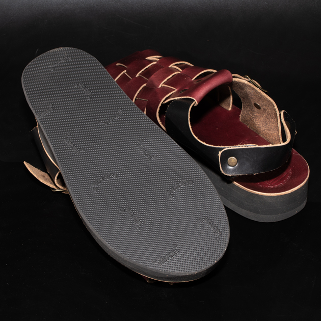 革素材の下地色はライトブラウンになっている為、グルカサンダル特有の編み込まれたアッパーの場合、断面がブラウン色に露出する為アクセントが効いております。