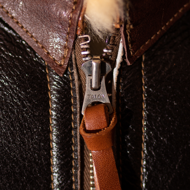 このB-6はインターミディエートゾーン用のフライトジャケットとして開発されており、ヘヴィーゾーン用のB-3(刈り込み3/4インチ)と比べて毛足を短く設定していた物です。