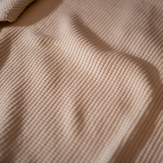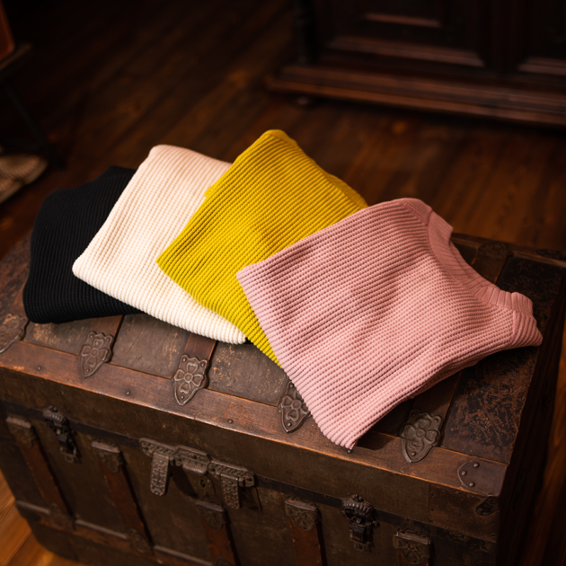 メリヤス工場を背景に持つブランドならではの特殊な編み機で編んだビッグワッフルは、もっちりとした柔らかい肌触りが特徴で、柔軟性に優れているため優しい着心地を実現しております。