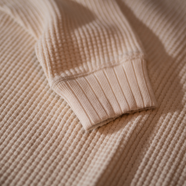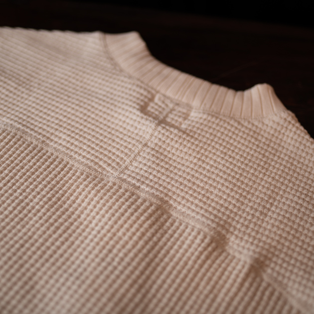 サーマル生地を変形させ、セーターのように着用できるJackmanのビッグワッフル素材。