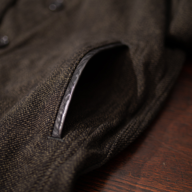 台襟裏・ヨーク裏・カフス裏・ポケットパイピングにレザーを使用する事で絶妙なアクセントと重厚感を演出。
