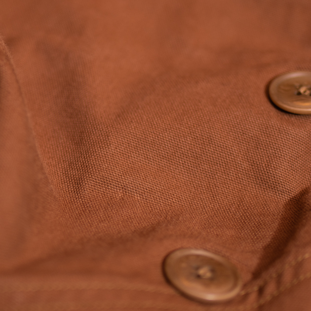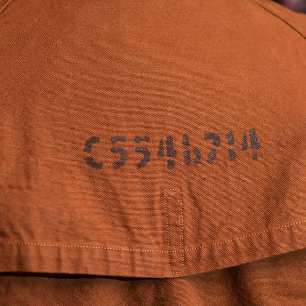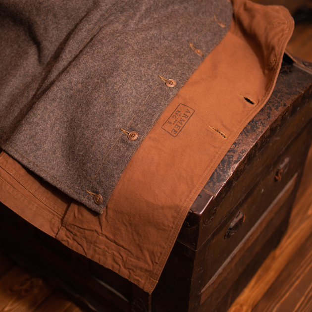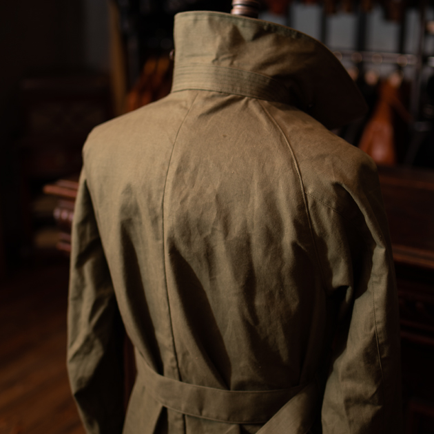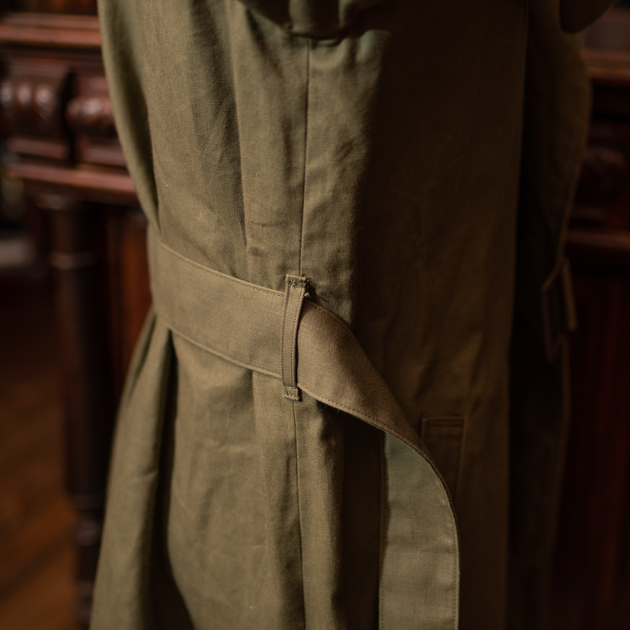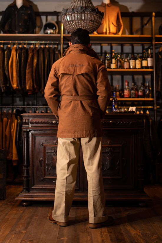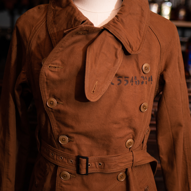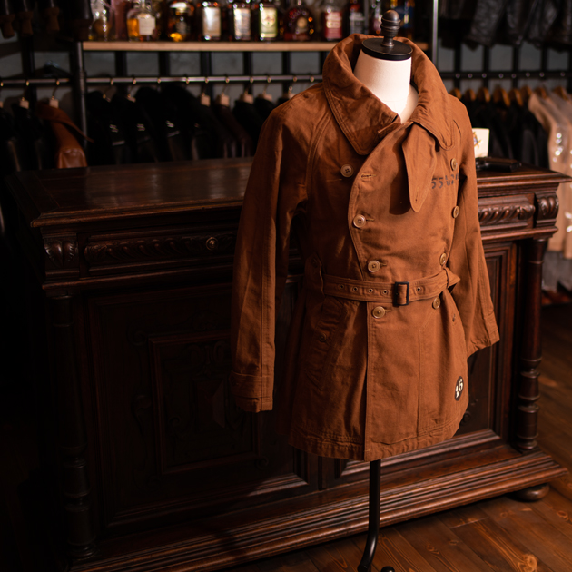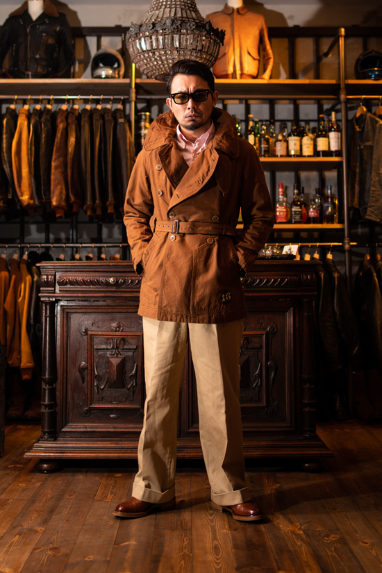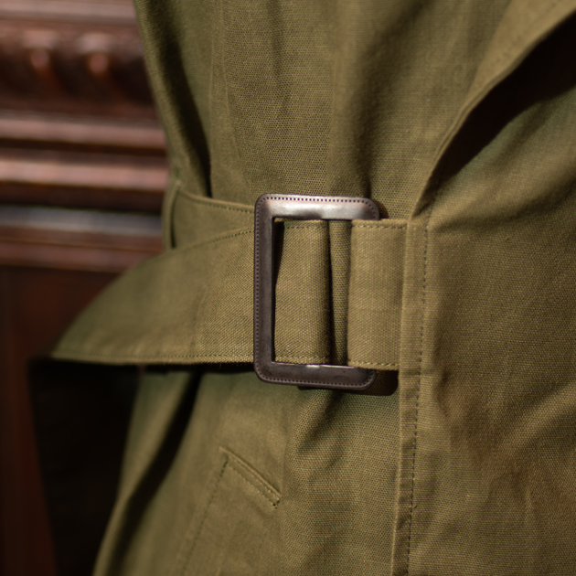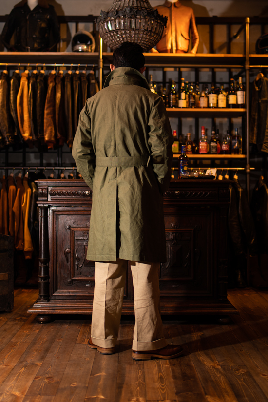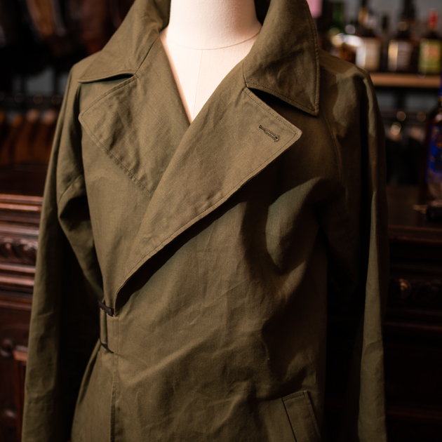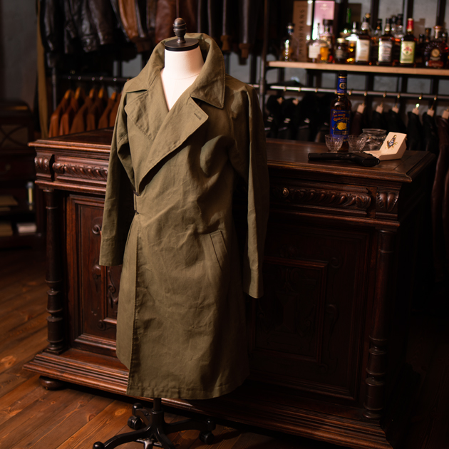 ダブルブレストでウエストベルトで締めあげるだけのディテールは、戦時下における装束として不要な物を排除した潔い仕様が魅力です。