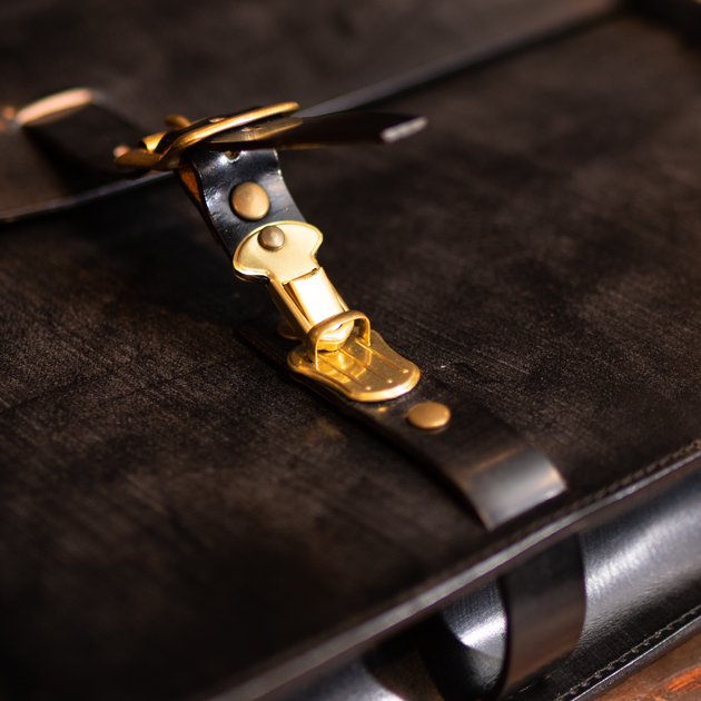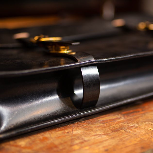 MAC BOOK等のノートパソコンを入れる際に下部のマチが垂れてこないようストラップを回し、耐久性を向上させている仕様です。
