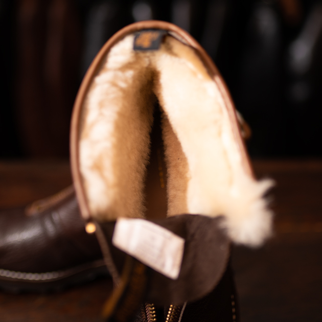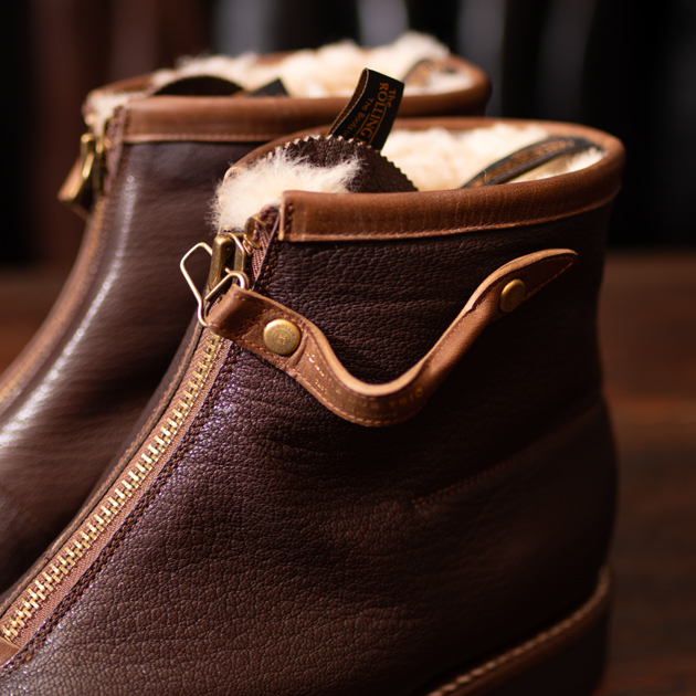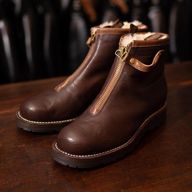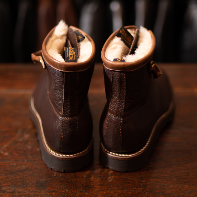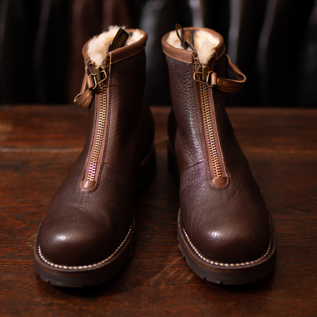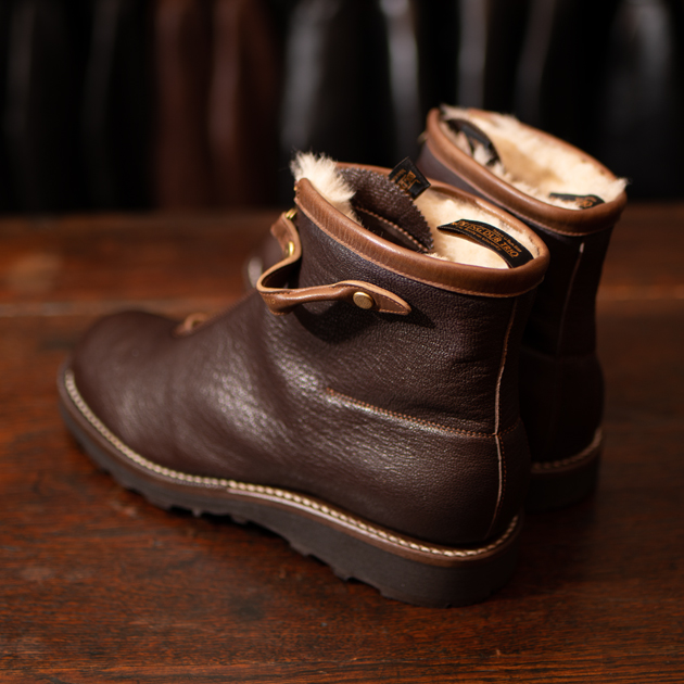 こちらもモデル、インナーライニングにムートンが使用されており、メインのアウターシェル(アッパーレザー)にはゴートスキン(山羊革)が使用されております。