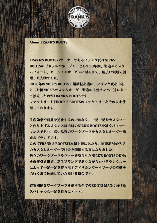この度FRANK’S BOOTS日本初上陸にあたり、MUSHMANSでのカスタムオーダー受注会を開催する事になりました。