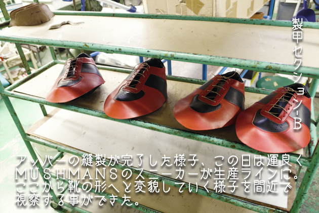これ、見覚えあるモデルでしょう? この日運良く(と言うよりもご配慮いただき)MUSHMANS Footwear All Leather Sneakerの生産がラインに乗っていた。