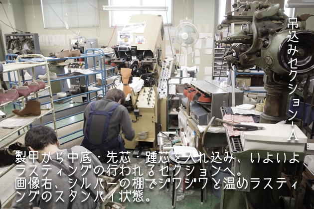 まず驚く事は、靴工場にありがちな雑然とした雰囲気が全く無く、整然とした工場内。