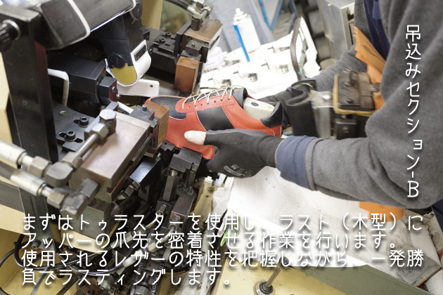 トゥラスターを用い、ラストの形状とアッパーのトゥ(爪先)が合うように圧力をかける。