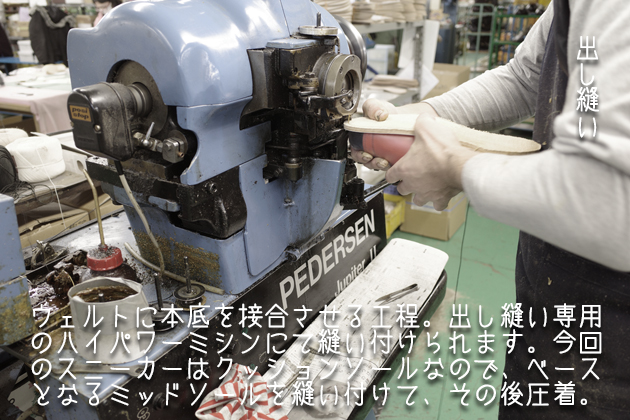 例えばビブラム#269などはミッドソールと共にゴムソールごと一緒に出し縫いしてしまうのだが、このスニーカーに使用するクッションソールはこのミッドソール材に圧着で取り付ける為、ここではミッドソールとウェルトのみをドッキングしている。