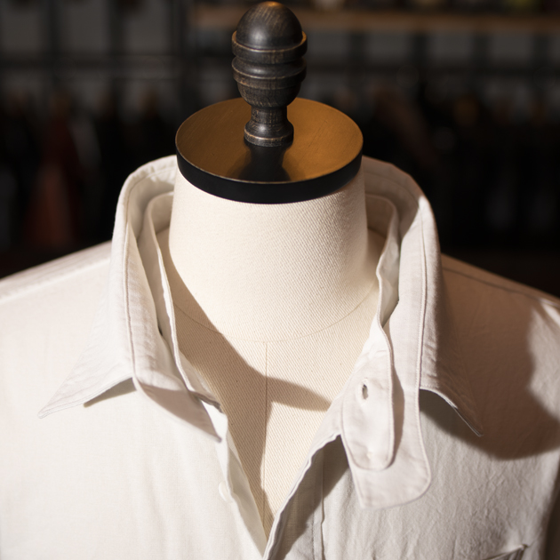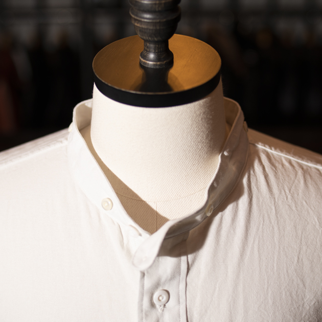 真夏なんかに使用する事が出来るファブリックですから、暑い時季にはバンドカラー(襟無し)で使用していただくのもお勧めです。