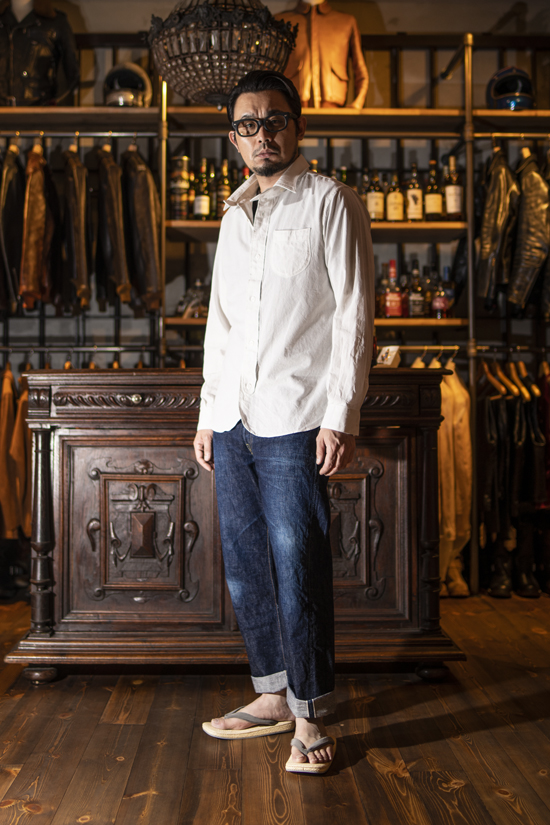 このように、襟を外してバンドカラー状態でのコーディネートも涼し気で良いです。