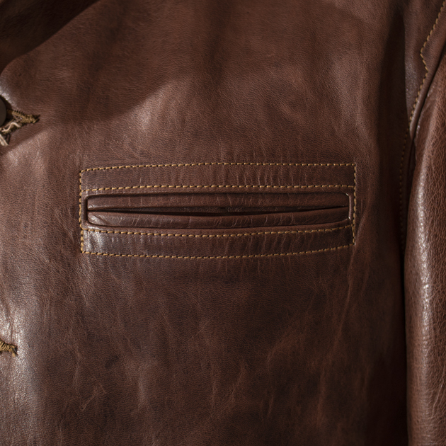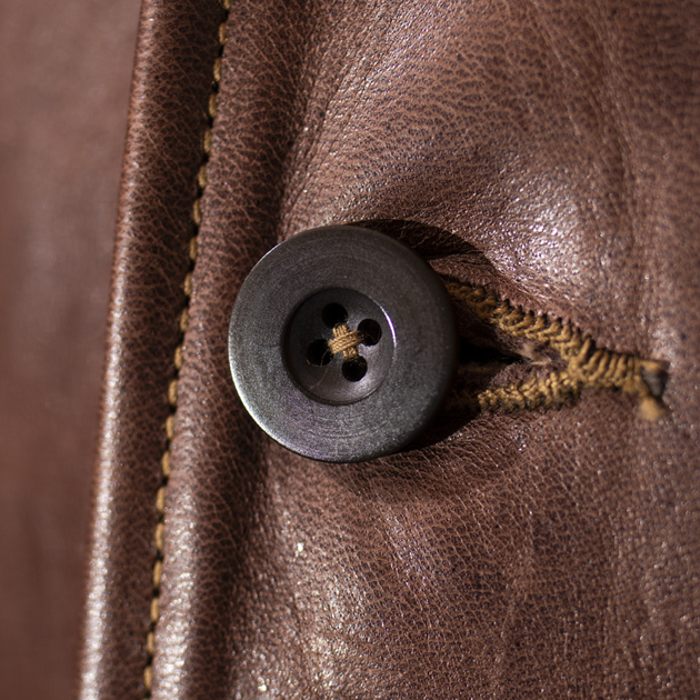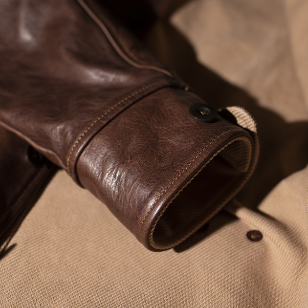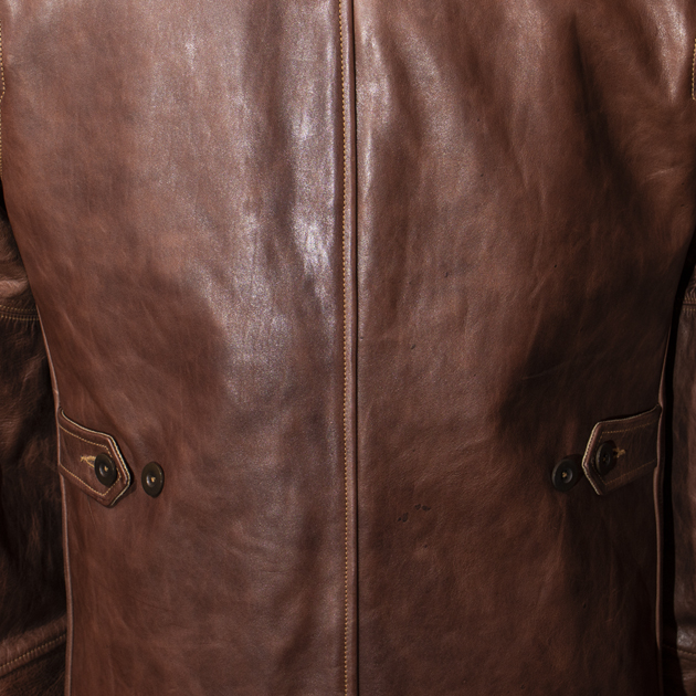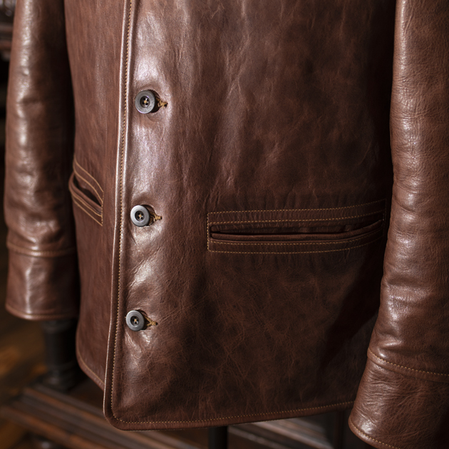 ピットタンニン法で鞣された革は、着ているだけでも自然と光沢が出てくるものです。その光沢感を新品時から一段階だけ促進させておく。そういった考え方から、このポリッシュ加工(グレージング)を用いました。