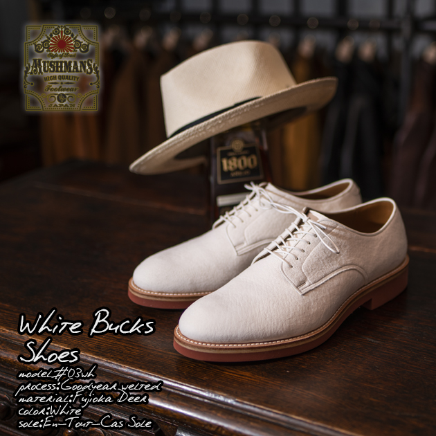 今シーズン、突発的に生産いたしまして、絶大なご指示をいただきましたMUSHMANS Footwear White Bucks Shoes。