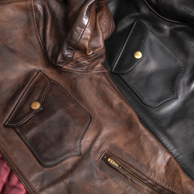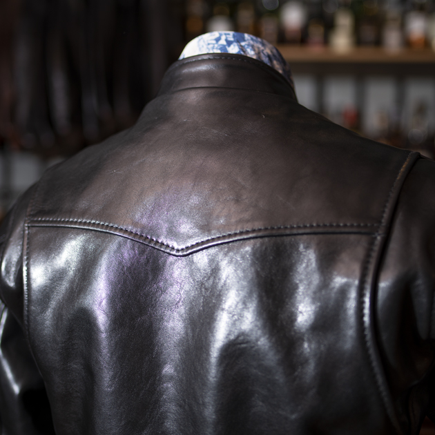 スタンドカラーシングルライダースとして、非常にバランスの良いシルエットとなっている。