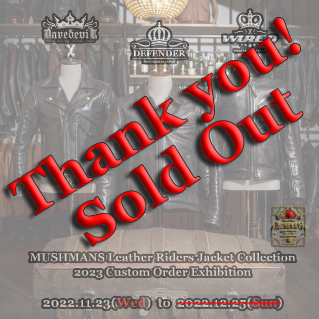 11月23日(水)からスタートいたしました【MUSHMANS Leather "Riders Collection 2023" Custom Order Exhibition】でございますが、先日も早期終了の可能性を告知いたしましたが、本日を持ちまして2023シーズンの生産限界数に達しました。