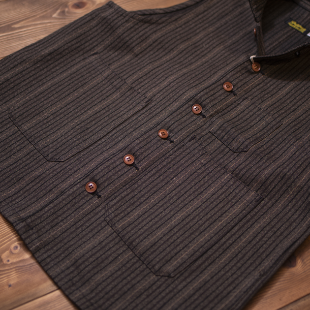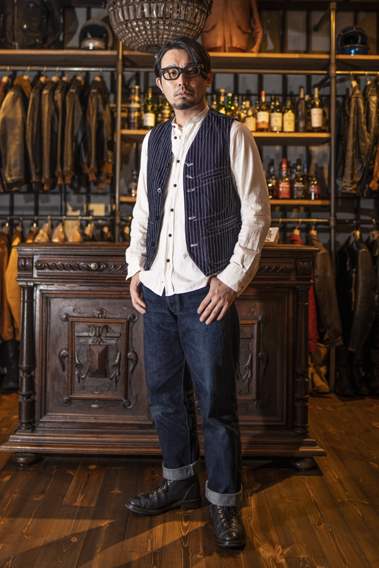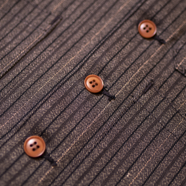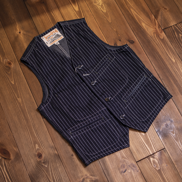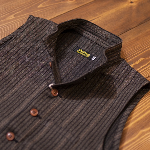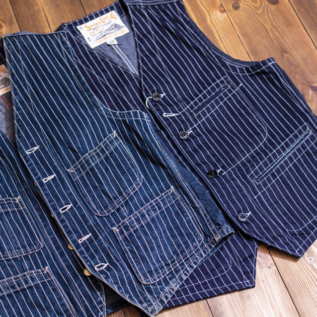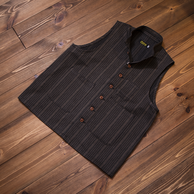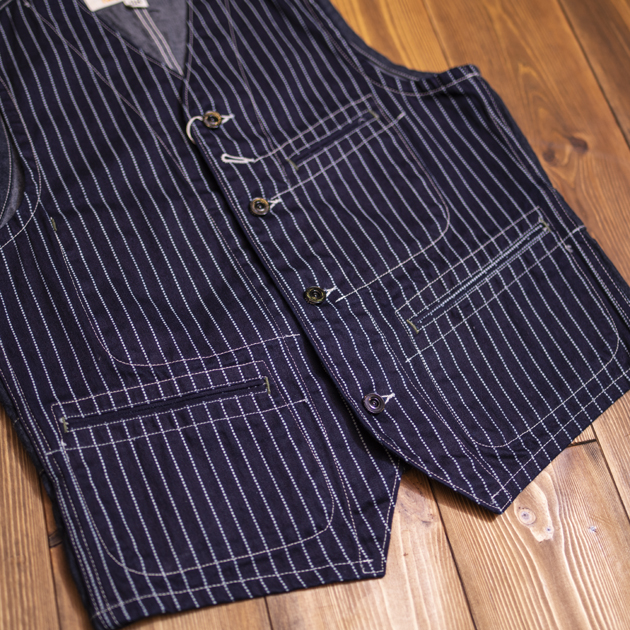 アメリカワークシーンのアイテムで、最も象徴的な生地とも言えるWABASH STRIPEのワークベスト。