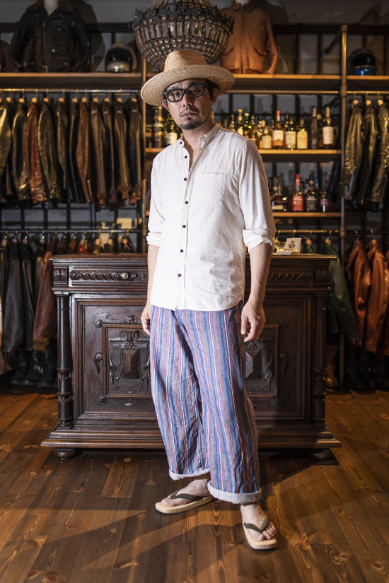 下駄と聞くと、歯が二枚の駒下駄を連想しますが、MUSHMANSのコーディネートに取り入れるには少々難しいところがあります。