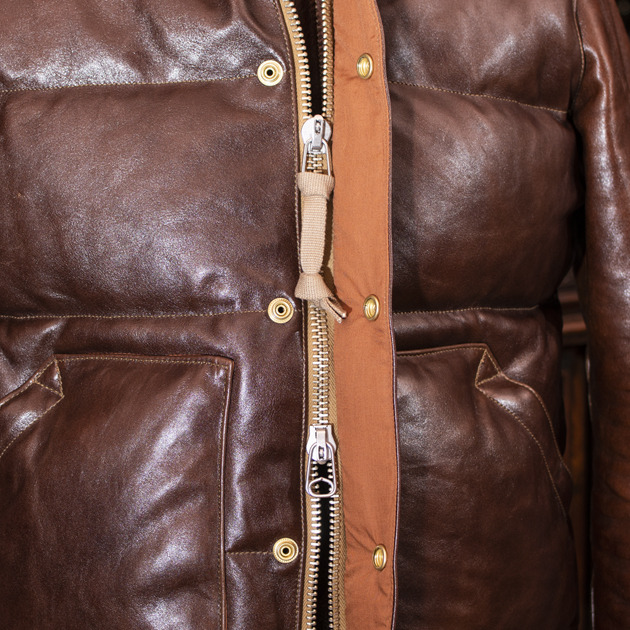 とは言え、革厚1.0mm程度の素材を選定して使用する為、ダウンベスト特有のボリューム感を損なう事はありません。