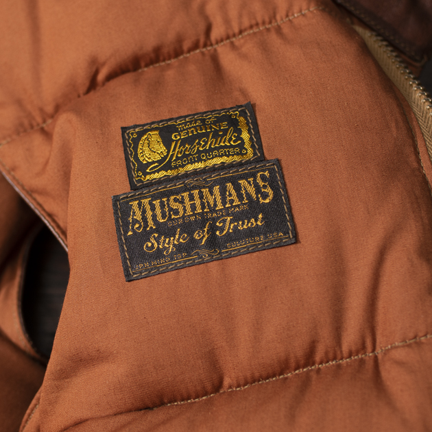 ここのところ、レザージャケット系は『MUSHMANS Leather』の大型ラベルを取り付けておりましたが、ダウンベストはステッチが多く入る為大型ラベルが使用できなかった関係で、こちらのラベルが装着されました。