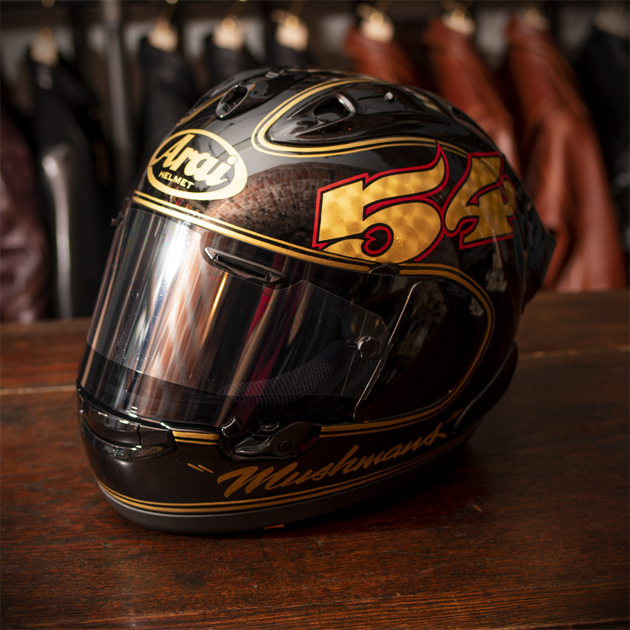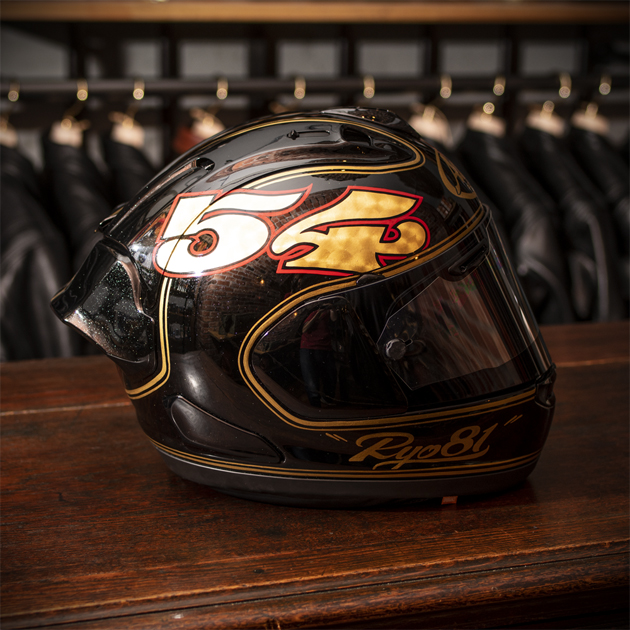 ヘルメットのベースモデルはArai Helmet/アライヘルメットの"RX-7X"のグラスブラックです。