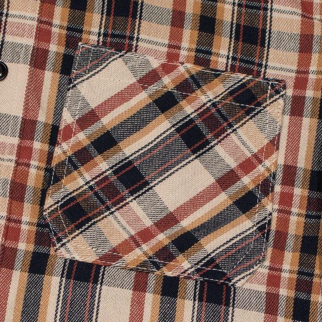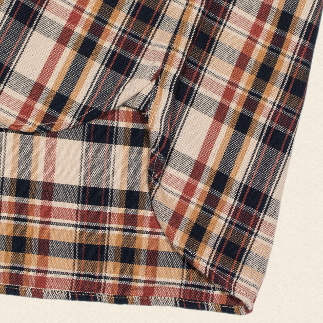 トリコロール色をチェック柄に仕上げ、前後左右、ポケットフラップ、台襟そして袖など柄合わせもバッチリです。