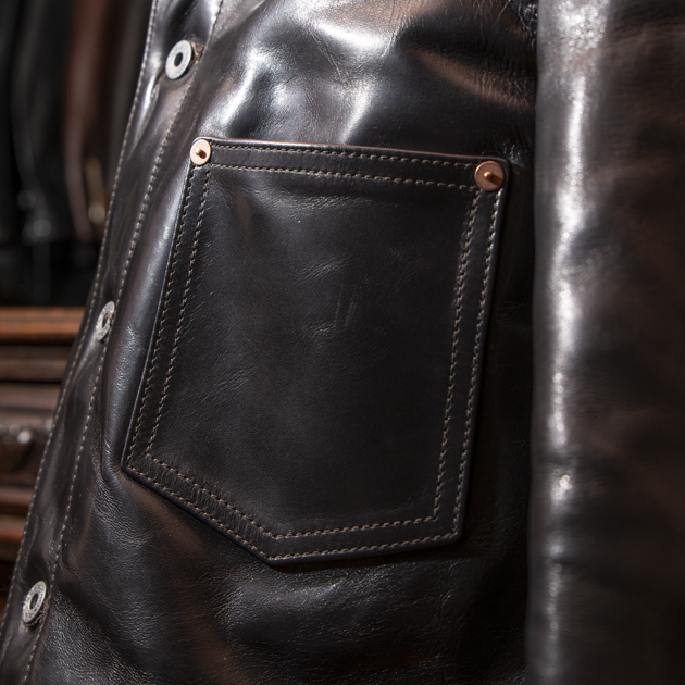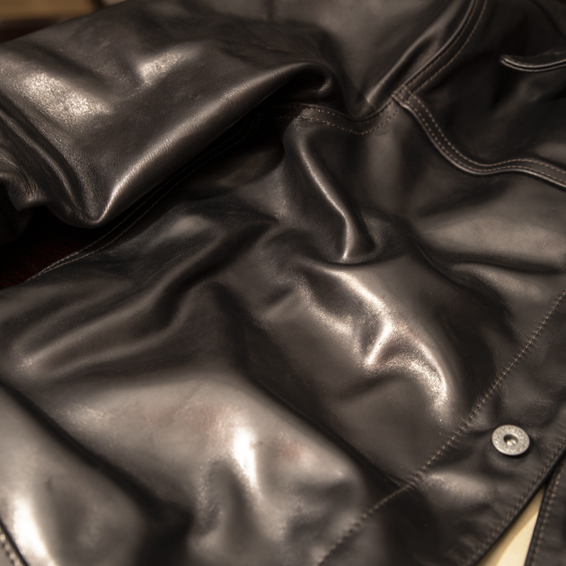 つまり、デニムジャケット(Gジャン)っていうのは、デニムファブリックだからカッコイイ訳で、そのままデザインをまるパクりするんじゃ芸が無い。という個人的な見解から、その雰囲気をレザーでやるなら『こうありたい。』という想いが入っている。